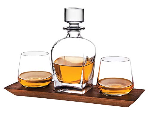 Godinger Whiskey Decanter and Whiskey Glasses Bar Set on Elegant Wooden Display Tray