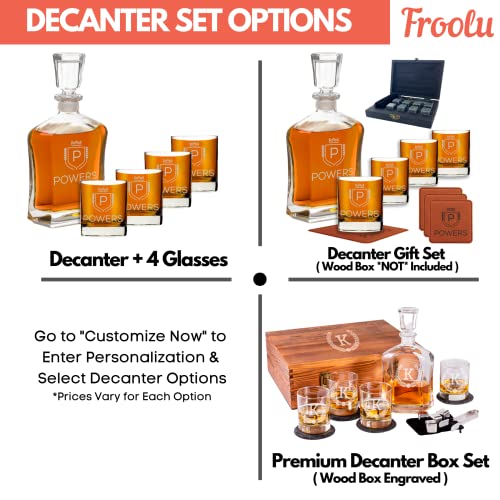 Personalized Whiskey Decanter Set for Men – 9 Design Options – Engraved Liquor Decanter Sets with Scotch Glasses – Gift Set for Him, Dad – Premium Set Includes Whiskey Stones – by Froolu