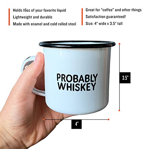 PROBABLY WHISKEY | Enamel “Coffee” Mug | Funny Bar Gift for Whiskey, Bourbon, and Scotch Lovers, Dads, Moms, Fathers, Men, Whisky Geeks | Practical Cup for Kitchen, Campfire, Home, and Travel